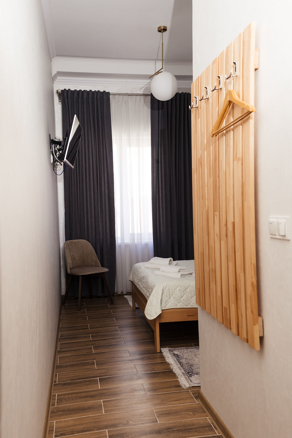 У номері передбачено все для комфортного проживання: сучасний санвузол з феном, рушниками, капцями та косметичними засобами, телевізор, кондиціонер, безкоштовний Wi-Fi, електрочайник і чашки для вашої ранкової кави або вечірнього чаю. Інтер’єр оформлено у спокійних тонах, а меблі підібрано з урахуванням ергономіки та естетики. Кожен номер готелю облаштований з турботою про гостей — усі приміщення обладнані якісними меблями, технікою та деталями, що роблять відпочинок по-справжньому зручним.