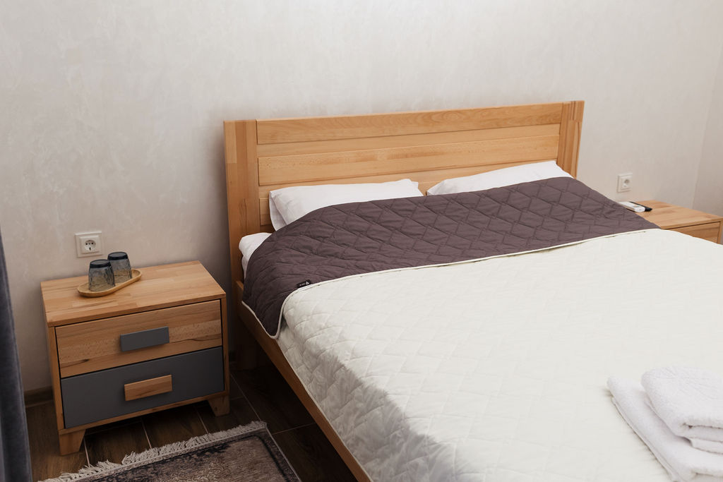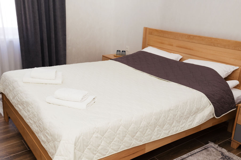 Просторий номер обладнаний великим двоспальним ліжком з якісною постіллю, м’якими подушками та теплими ковдрами, що забезпечать вам здоровий і приємний сон.